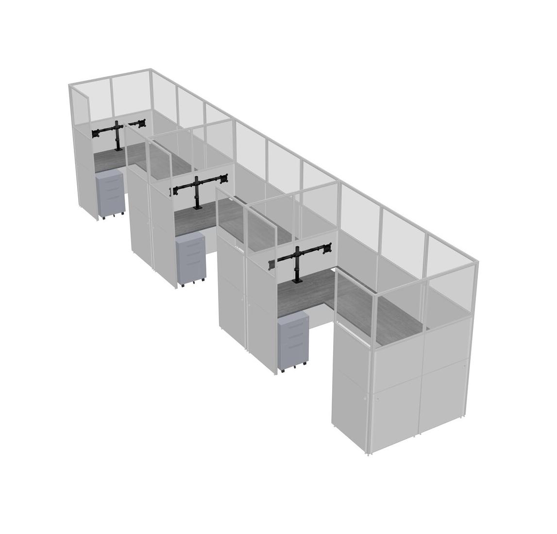 Grey U-shaped Panel System For 3 Person + Monitor Arm (double Arms) + Metal Mobile Drawers For 3 User(s)