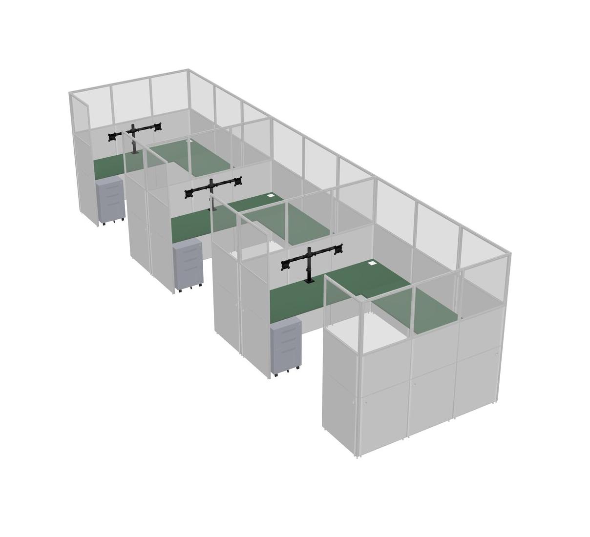 Green U-shaped Panel System For 3 Person + Monitor Arm (double Arms) + Metal Mobile Drawers For 3 User(s)