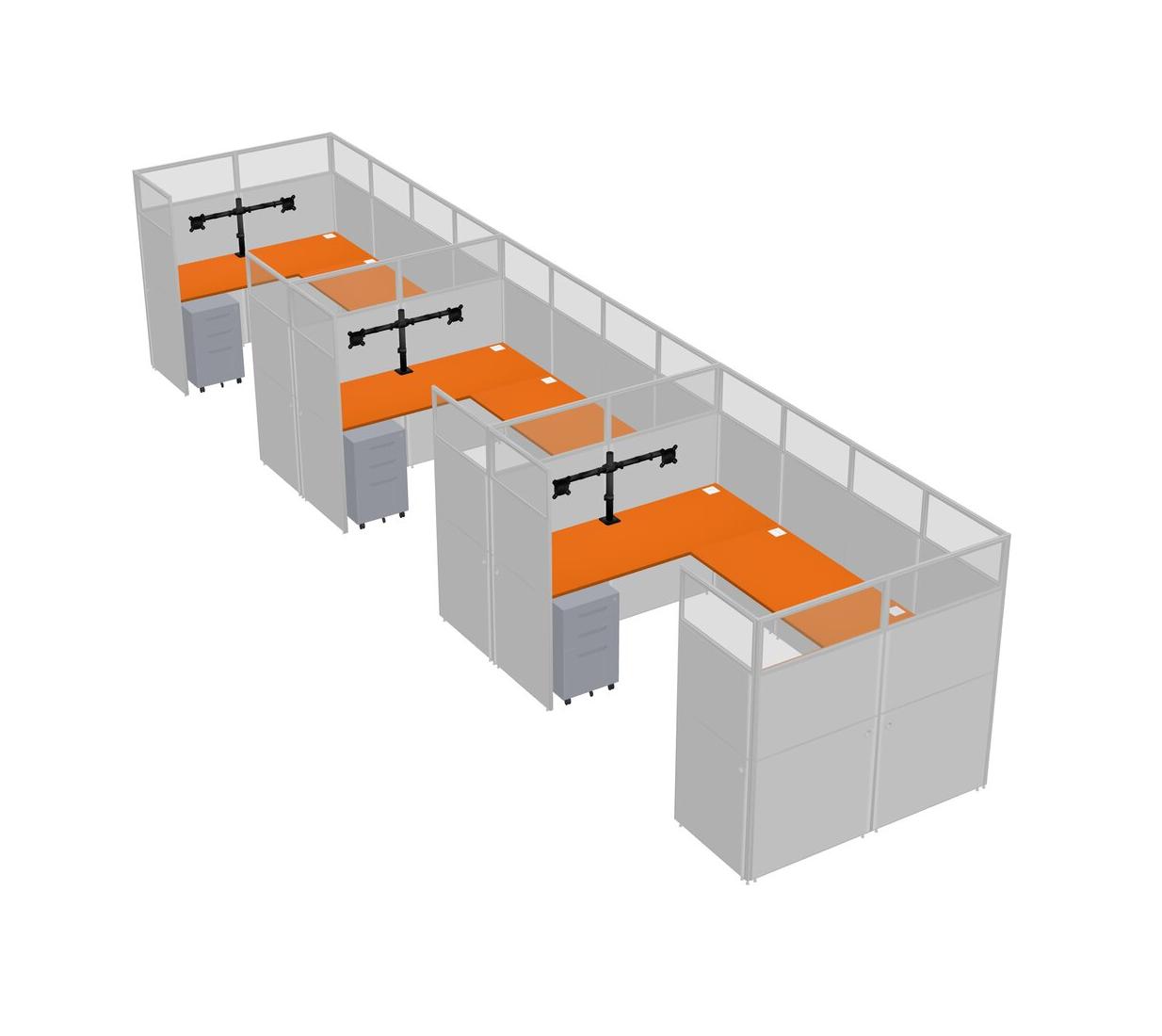 Orange U-shaped Panel System For 3 Person + Monitor Arm (double Arms) + Metal Mobile Drawers For 3 User(s)