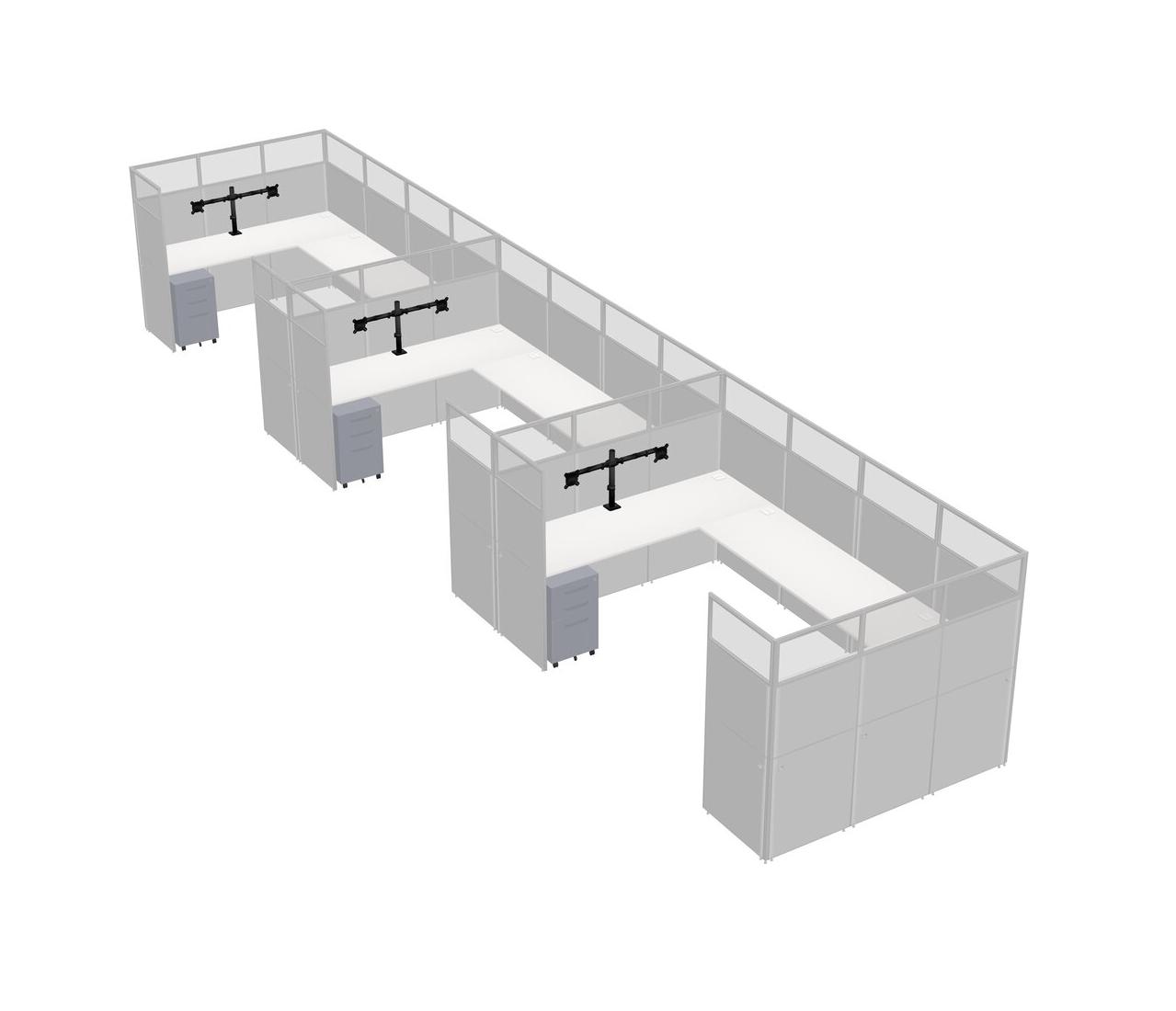 White U-shaped Panel System For 3 Person + Monitor Arm (double Arms) + Metal Mobile Drawers For 3 User(s)