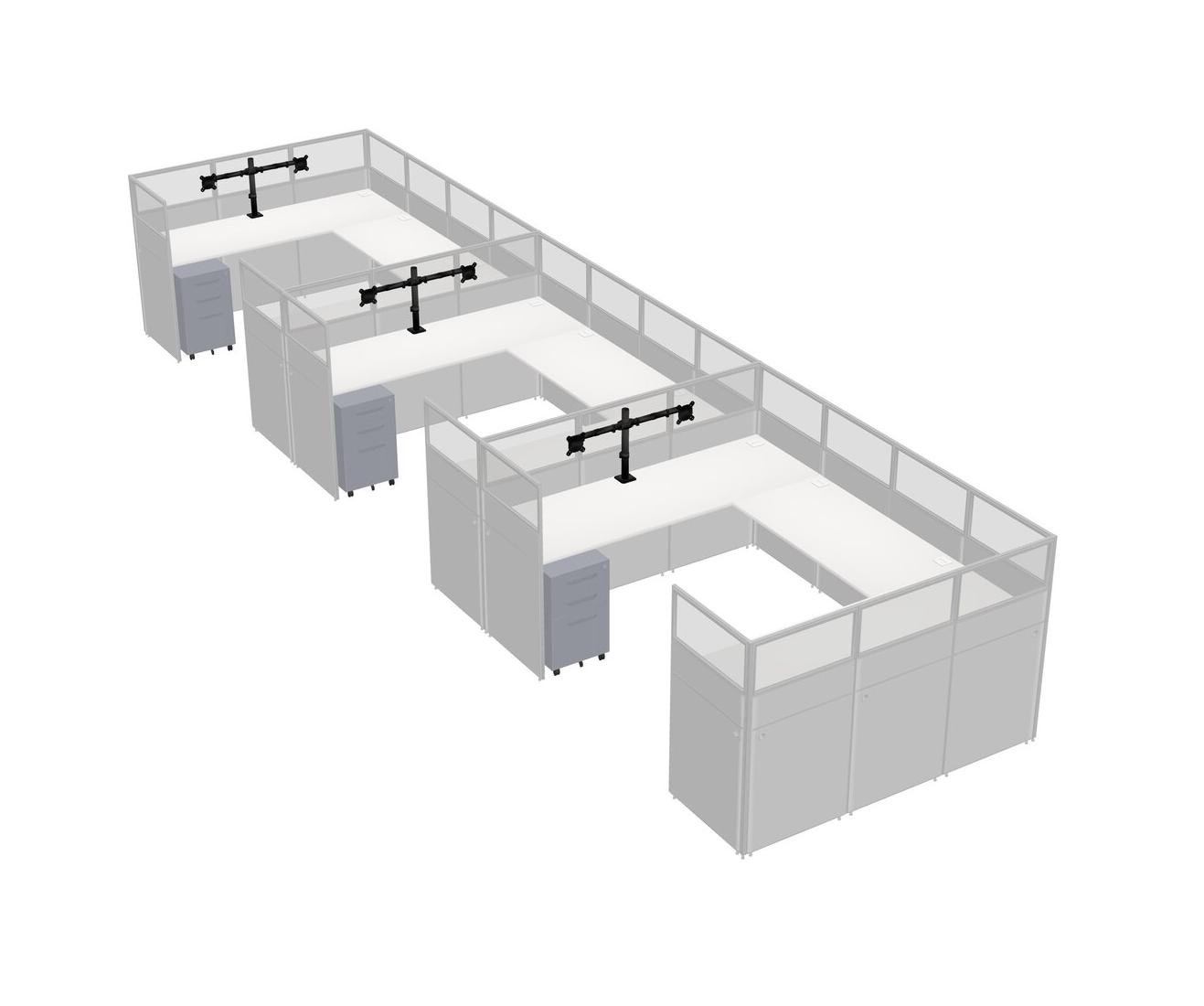 White U-shaped Panel System For 3 Person + Monitor Arm (double Arms) + Metal Mobile Drawers For 3 User(s)
