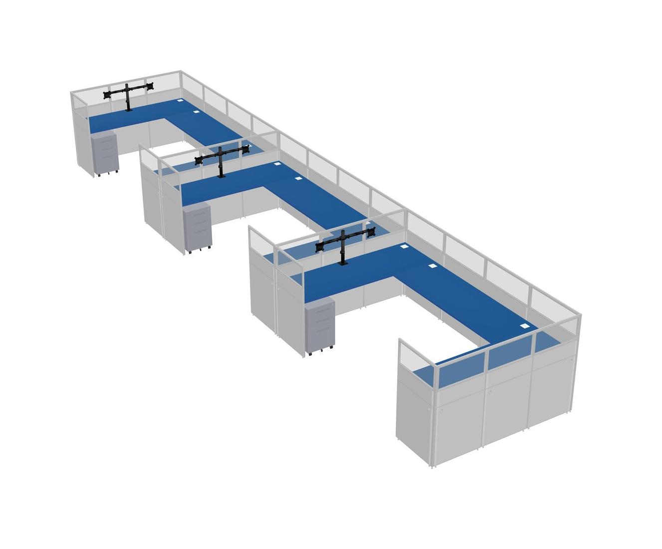 Prism Blue U-shaped Panel System For 3 Person + Monitor Arm (double Arms) + Metal Mobile Drawers For 3 User(s)