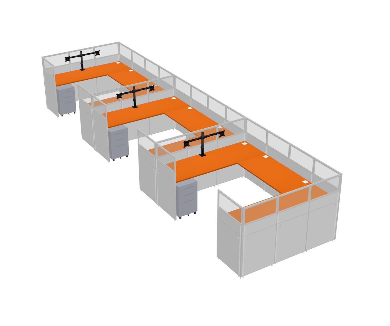 Orange U-shaped Panel System For 3 Person + Monitor Arm (double Arms) + Metal Mobile Drawers For 3 User(s)
