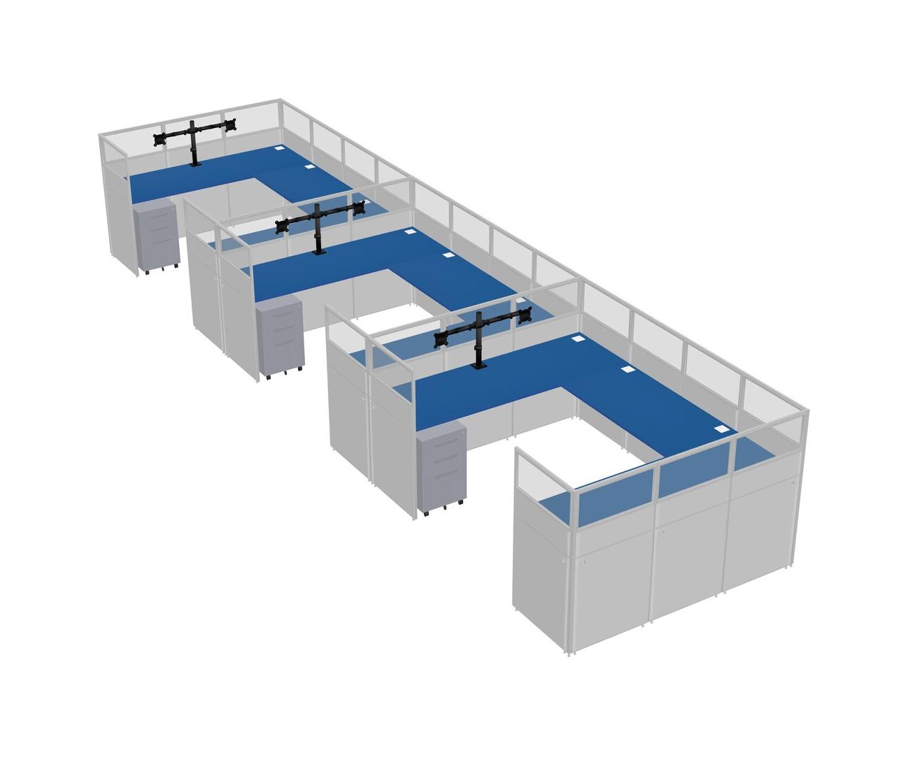 Prism Blue U-shaped Panel System For 3 Person + Monitor Arm (double Arms) + Metal Mobile Drawers For 3 User(s)
