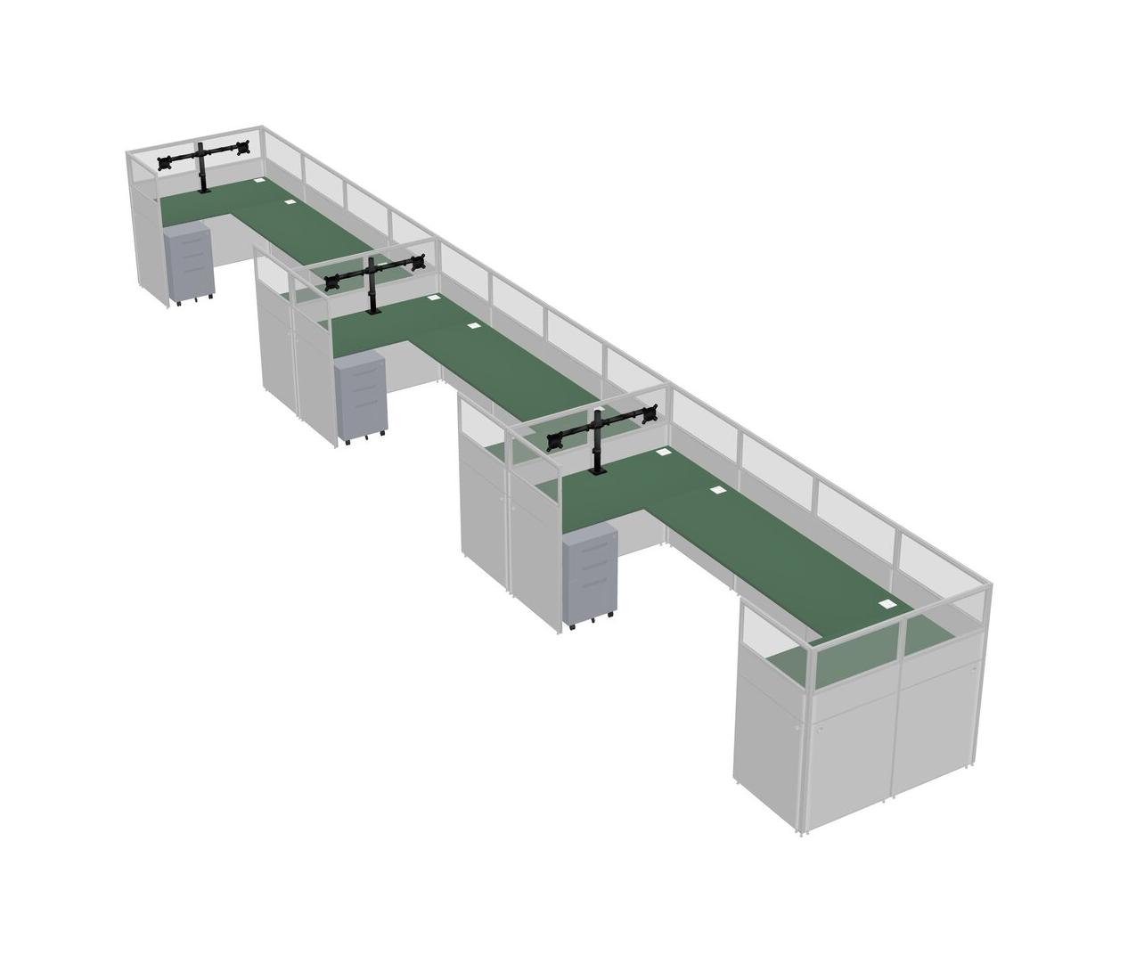Green U-shaped Panel System For 3 Person + Monitor Arm (double Arms) + Metal Mobile Drawers For 3 User(s)