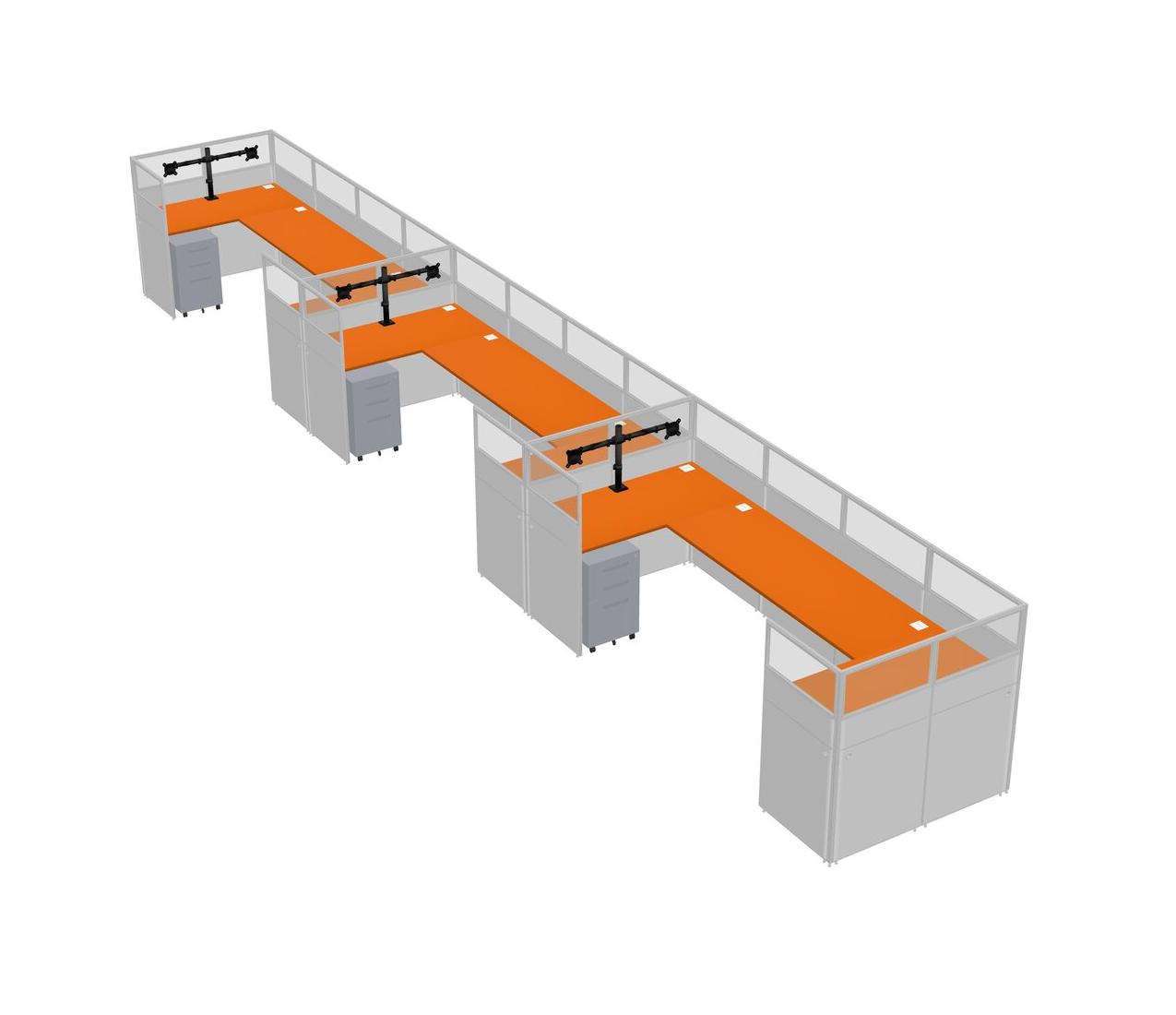 Orange U-shaped Panel System For 3 Person + Monitor Arm (double Arms) + Metal Mobile Drawers For 3 User(s)