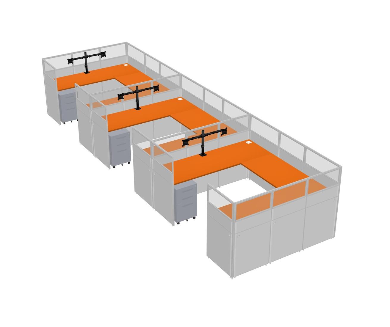 Orange U-shaped Panel System For 3 Person + Monitor Arm (double Arms) + Metal Mobile Drawers For 3 User(s)