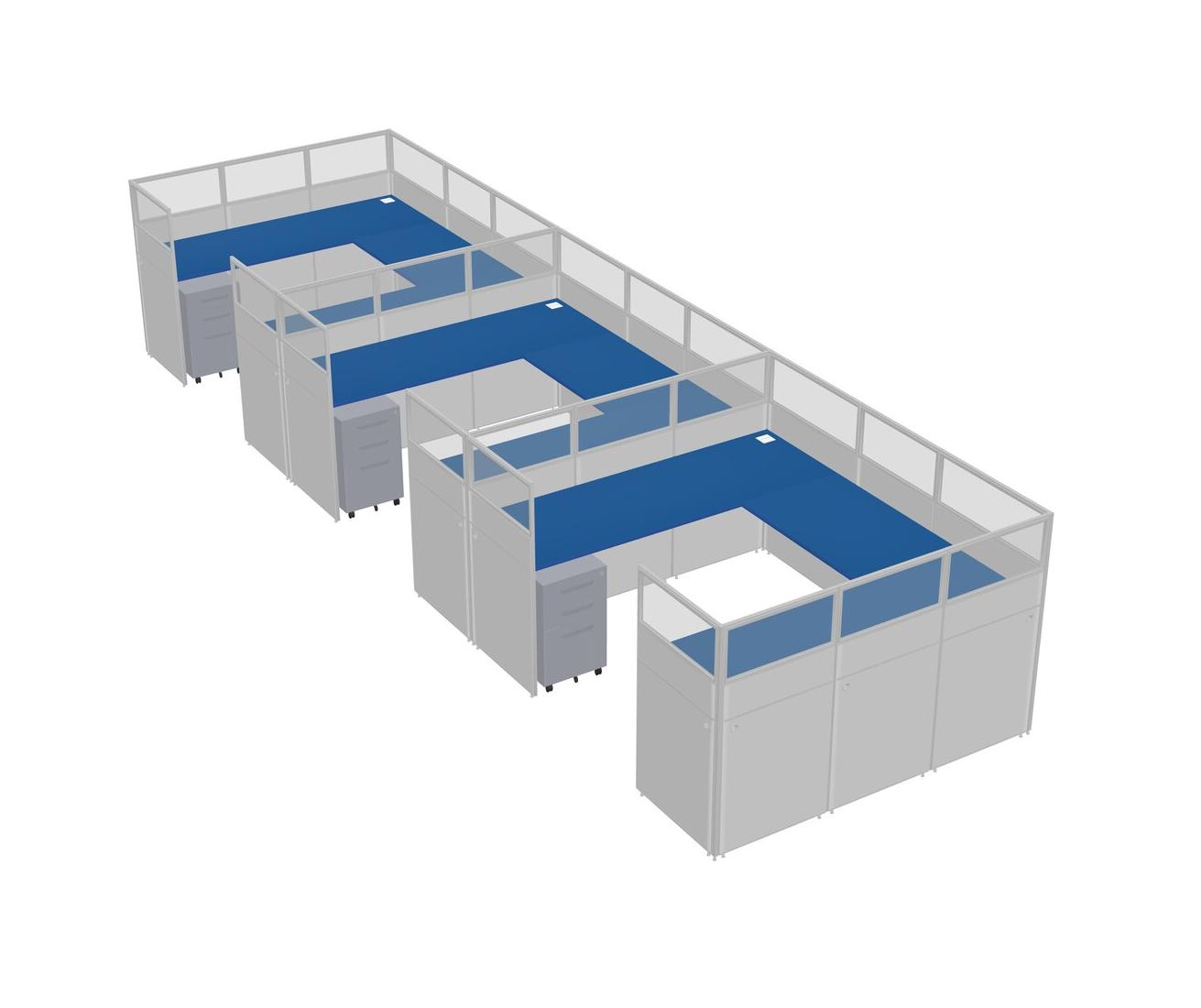 Prism Blue U-shaped Panel System For 3 Person + Metal Mobile Drawers For 3 User(s)