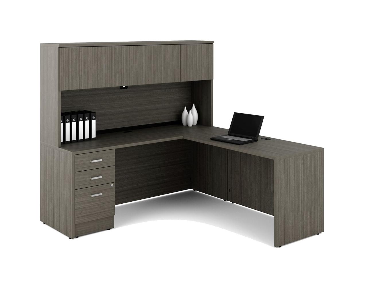 Absolute Acajou L-Shaped Commercial Grade Office Desk With Fixed Drawers + With Hutch
