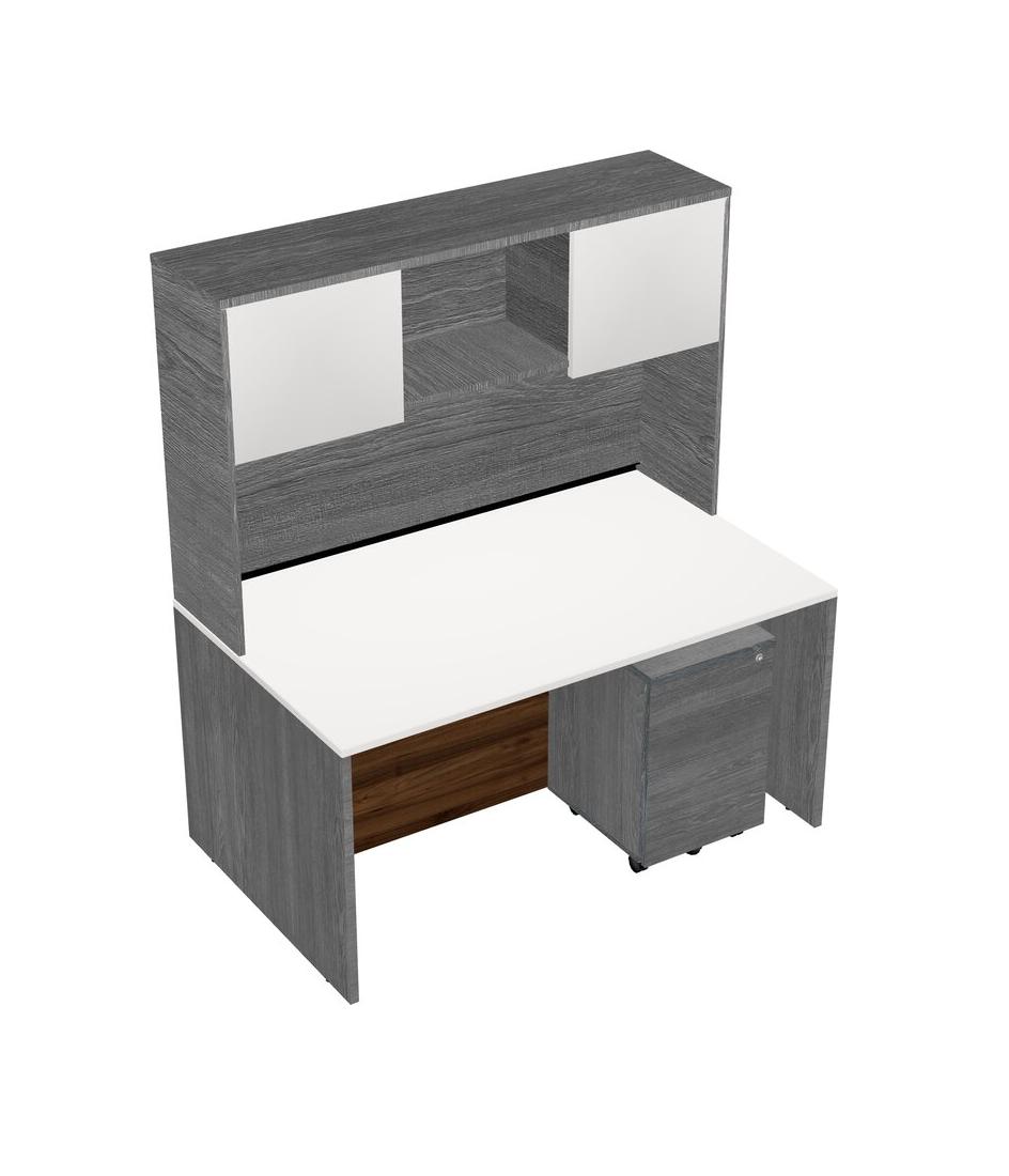 White Rectangular Office Desk Plus Grey Wooden Mobile Drawers And Grey Hutch