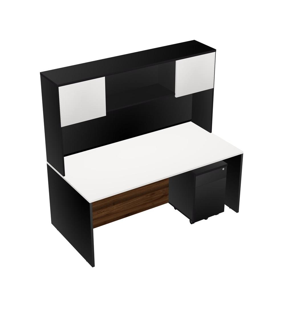 White Rectangular Office Desk Plus Black Wooden Mobile Drawers And Black Hutch