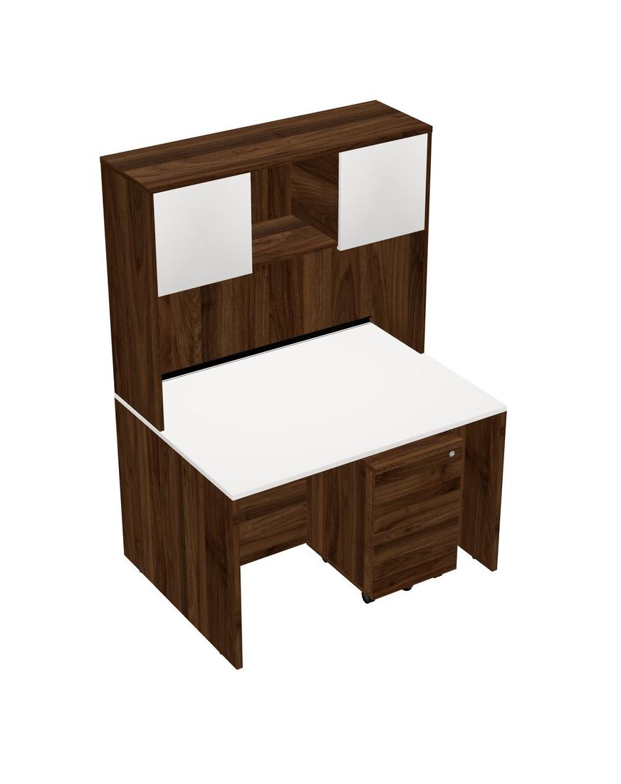 White Rectangular Office Desk Plus Columbia Walnut Wooden Mobile Drawers And Columbia Walnut Hutch