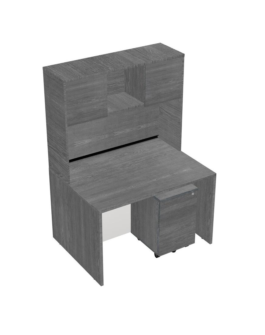 Grey Rectangular Office Desk Plus Grey Wooden Mobile Drawers And Grey Hutch