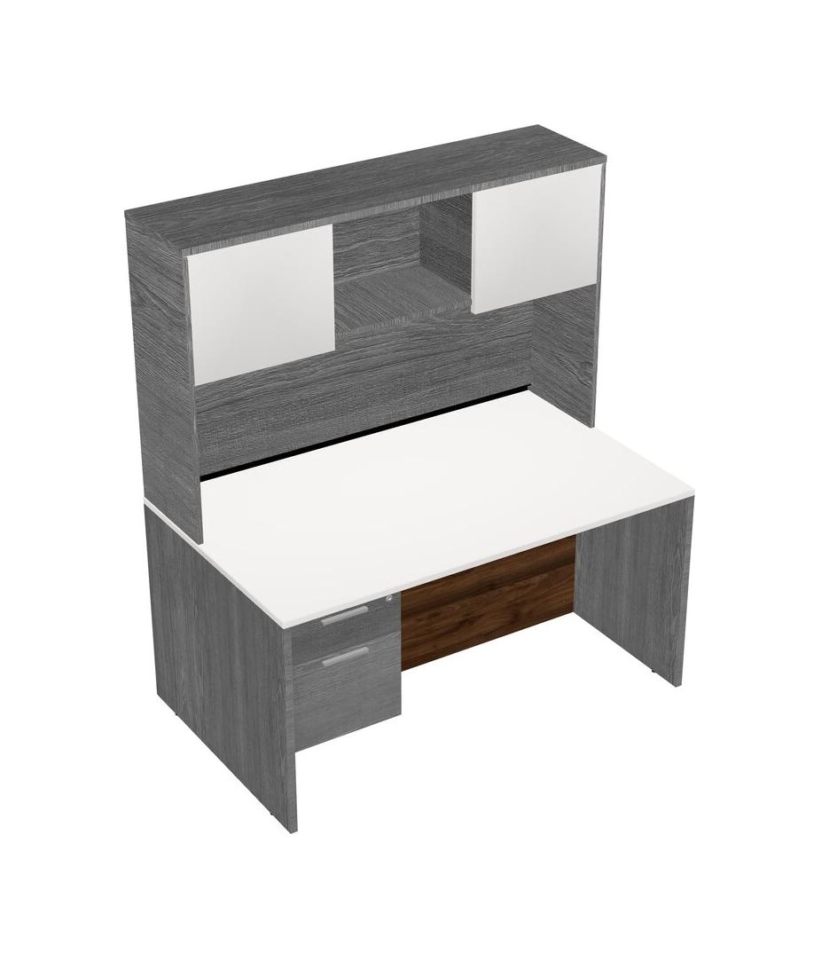White Rectangular Office Desk Plus Grey Hanging Drawers And Grey Hutch