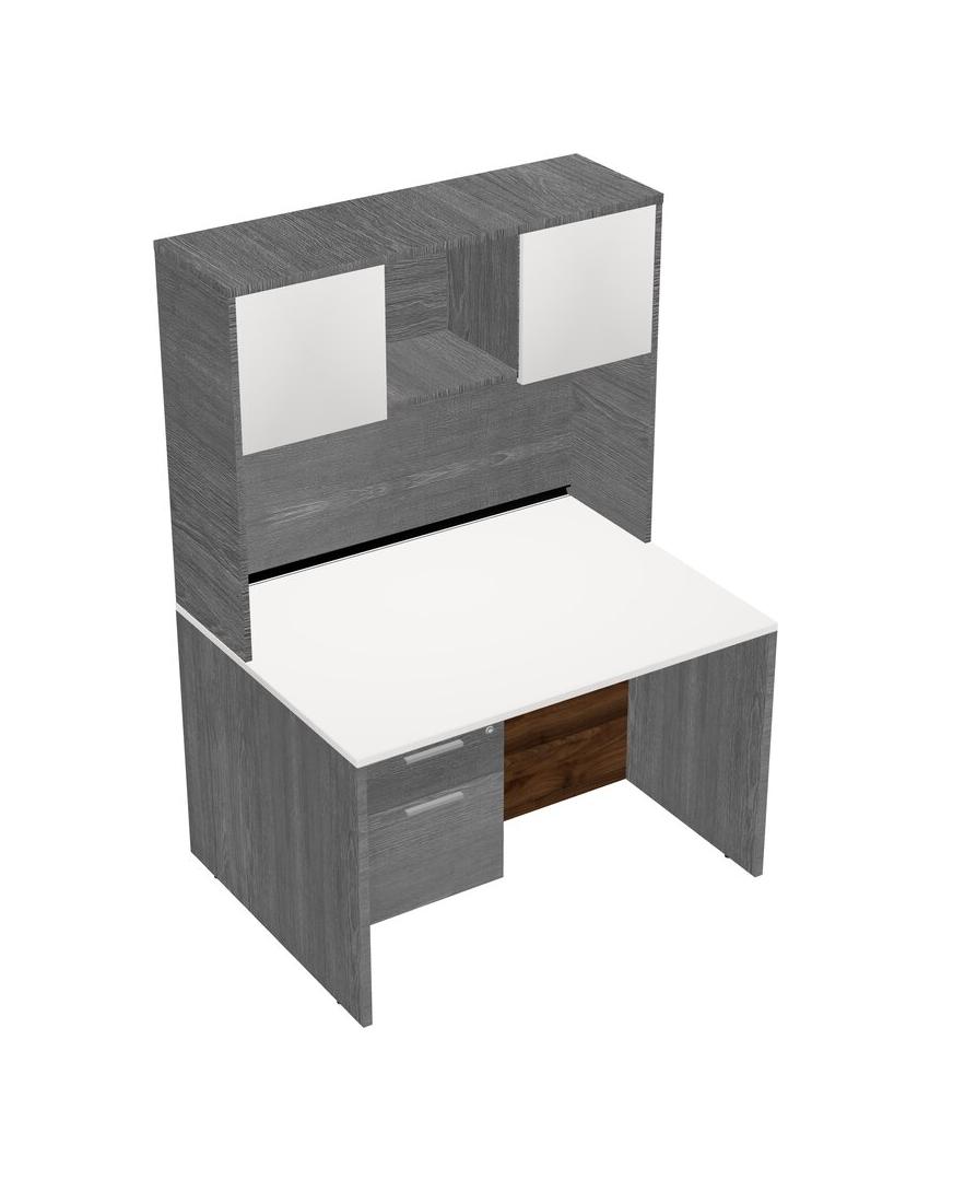 White Rectangular Office Desk Plus Grey Hanging Drawers And Grey Hutch