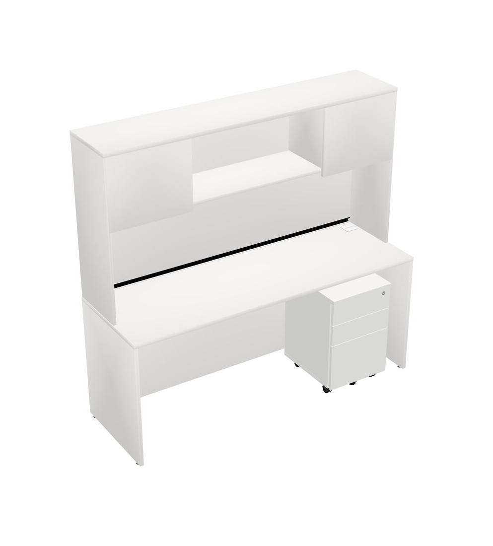 White Rectangular Office Desk Plus White Wooden Mobile Drawers And White Hutch
