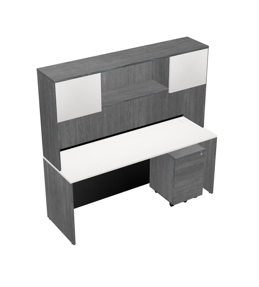 White Rectangular Office Desk Plus Grey Wooden Mobile Drawers And Grey Hutch