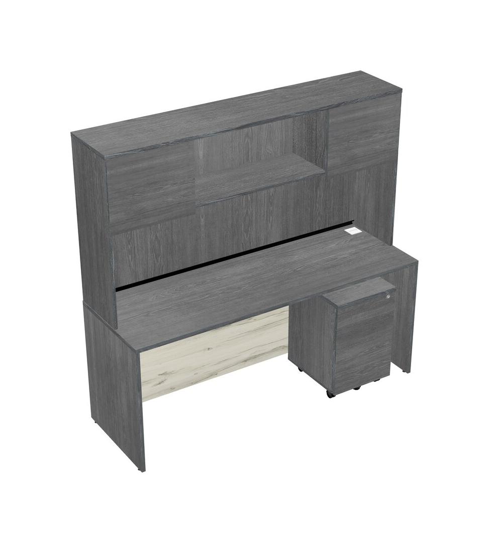 Grey Rectangular Office Desk Plus Grey Wooden Mobile Drawers And Grey Hutch