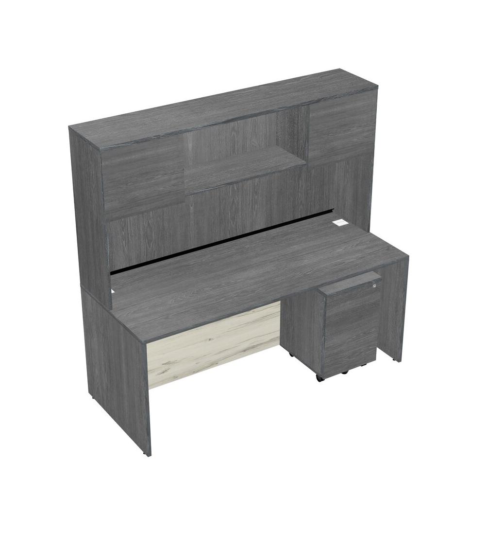 Grey Rectangular Office Desk Plus Grey Wooden Mobile Drawers And Grey Hutch