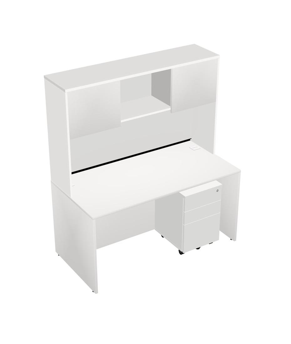 White Rectangular Office Desk Plus White Wooden Mobile Drawers And White Hutch