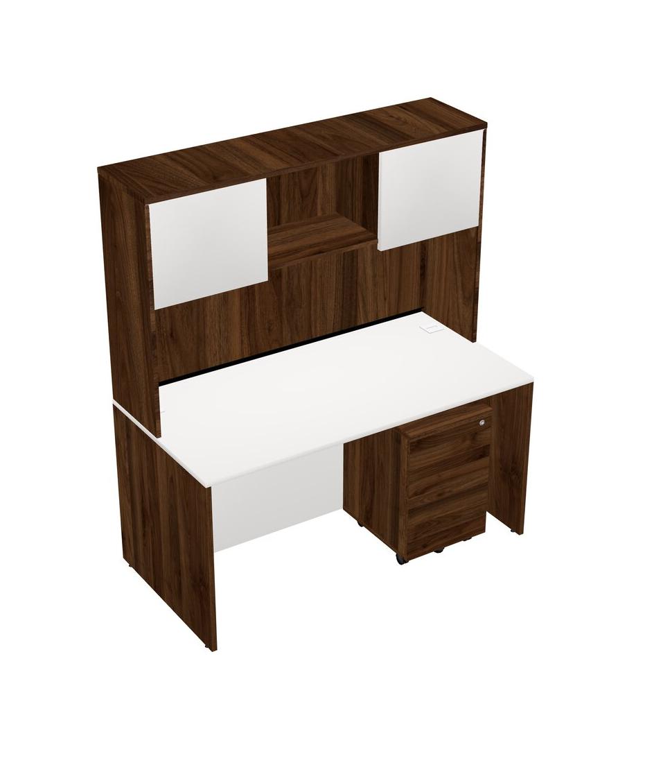 White Rectangular Office Desk Plus Columbia Walnut Wooden Mobile Drawers And Columbia Walnut Hutch