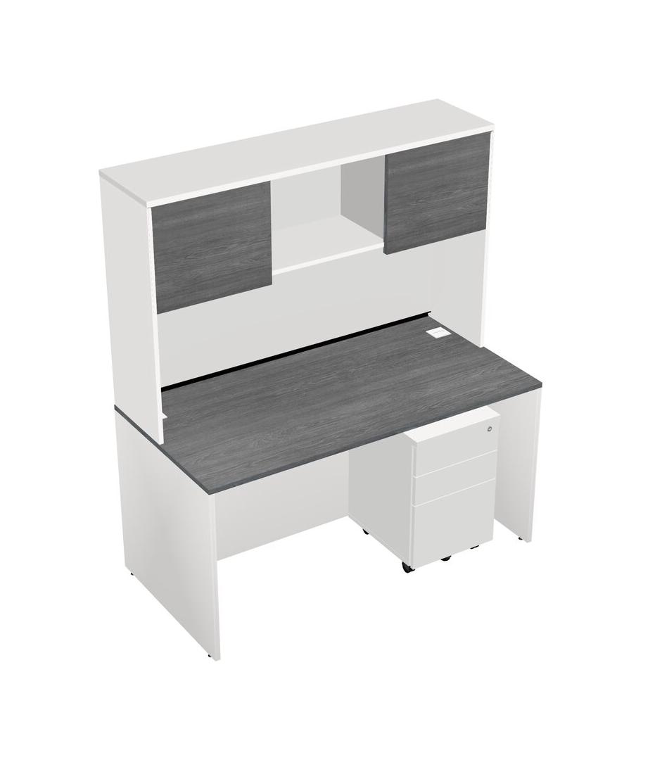 Grey Rectangular Office Desk Plus White Wooden Mobile Drawers And White Hutch