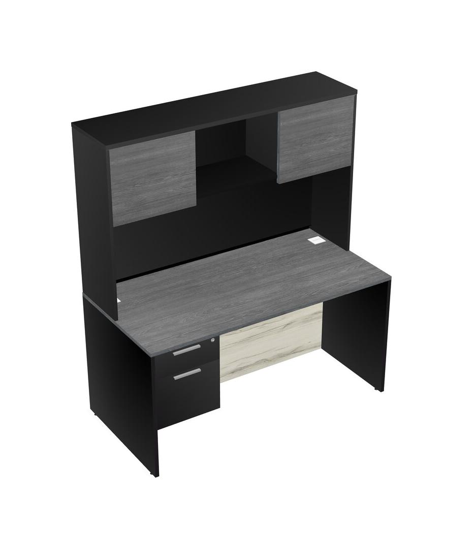 Grey Rectangular Office Desk Plus Black Hanging Drawers And Black Hutch