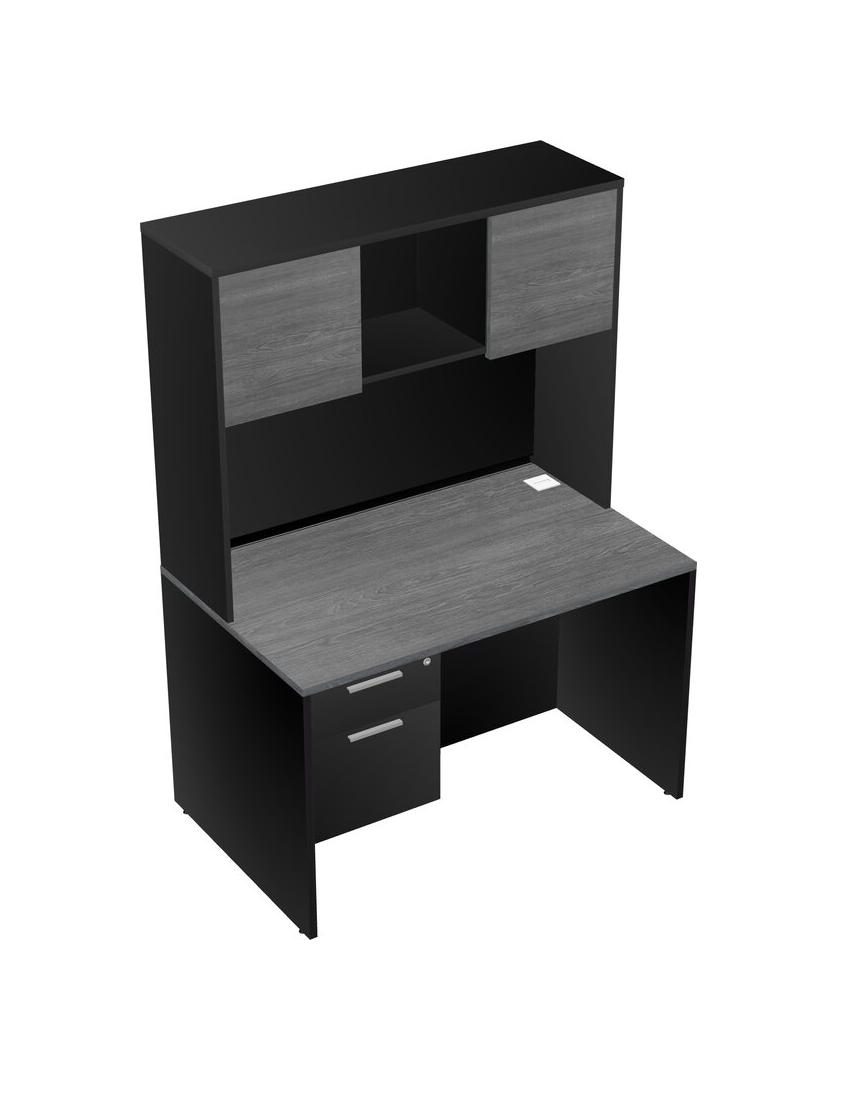 Grey Rectangular Office Desk Plus Black Hanging Drawers And Black Hutch