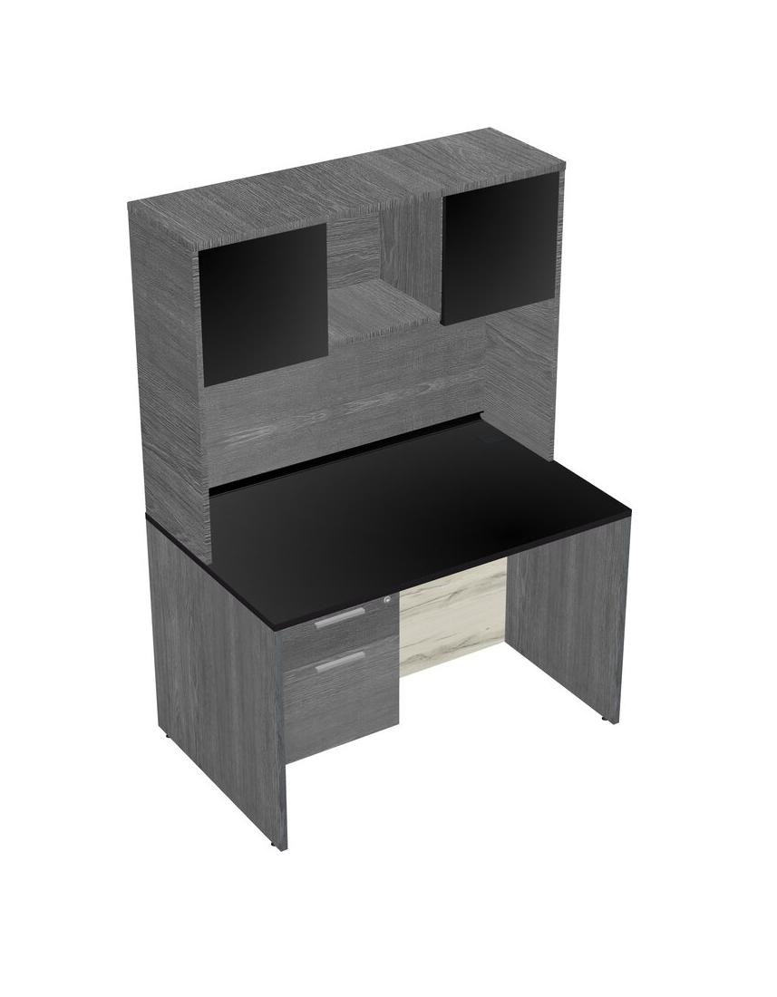 Black Rectangular Office Desk Plus Grey Hanging Drawers And Grey Hutch