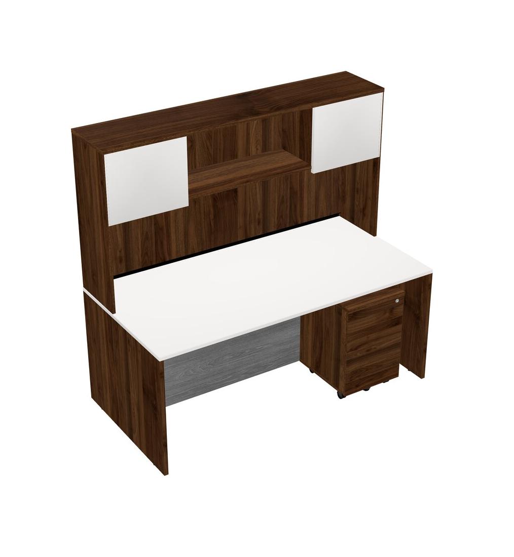 White Rectangular Office Desk Plus Columbia Walnut Wooden Mobile Drawers And Columbia Walnut Hutch