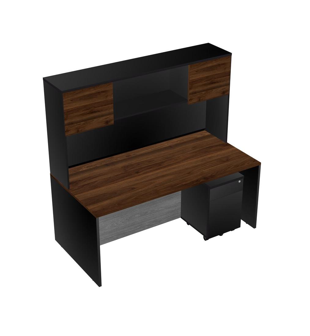Columbia Walnut Rectangular Office Desk Plus Black Wooden Mobile Drawers And Black Hutch