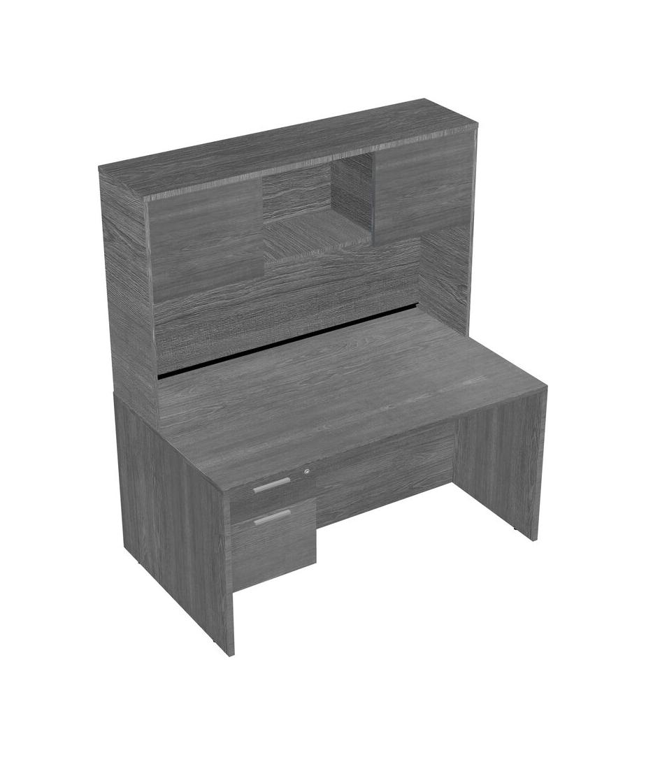 Grey Rectangular Office Desk Plus Grey Hanging Drawers And Grey Hutch