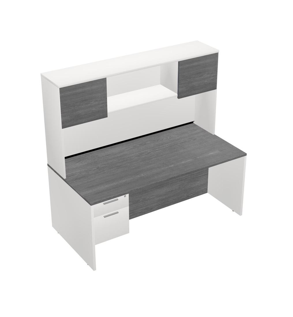 Grey Rectangular Office Desk Plus White Hanging Drawers And White Hutch