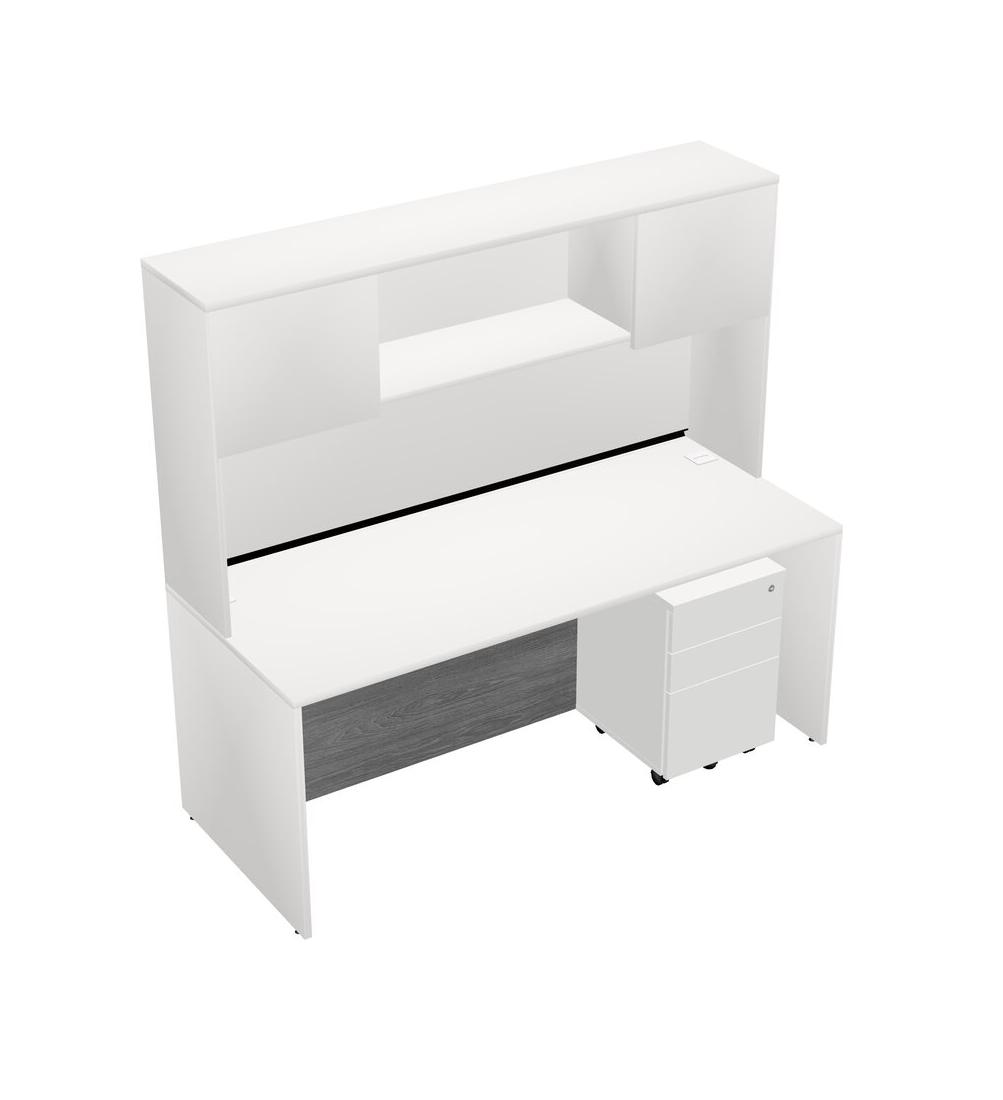 White Rectangular Office Desk Plus White Wooden Mobile Drawers And White Hutch