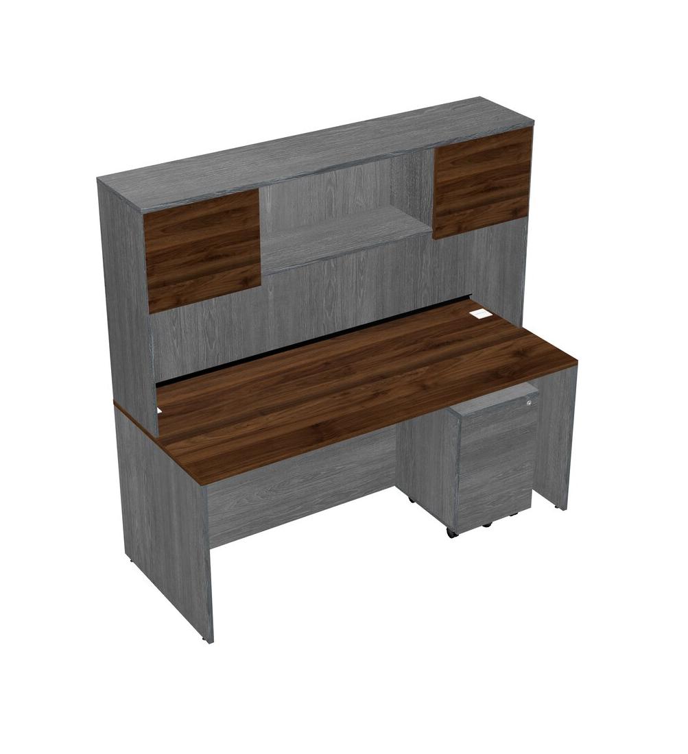 Columbia Walnut Rectangular Office Desk Plus Grey Wooden Mobile Drawers And Grey Hutch