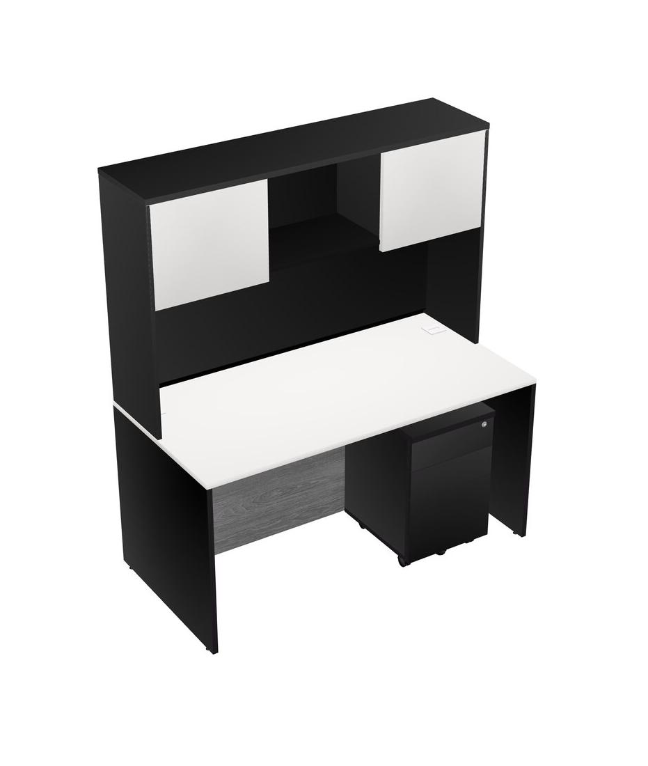 White Rectangular Office Desk Plus Black Wooden Mobile Drawers And Black Hutch