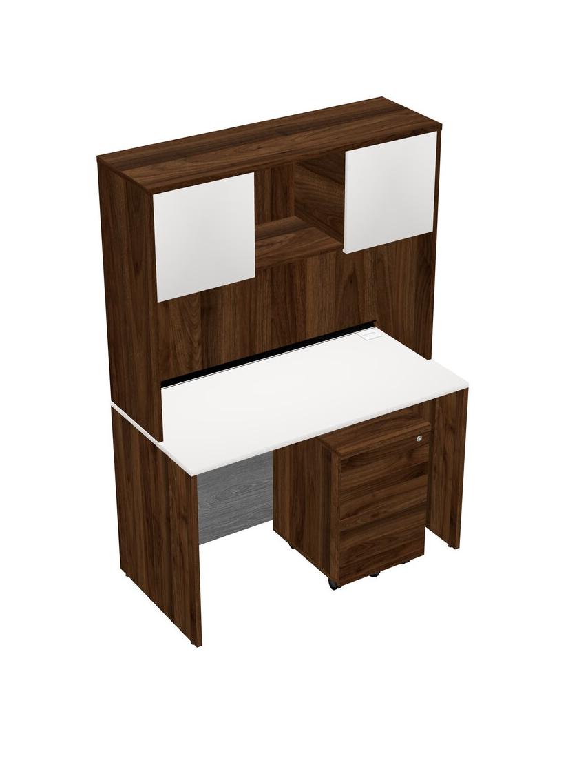 White Rectangular Office Desk Plus Columbia Walnut Wooden Mobile Drawers And Columbia Walnut Hutch