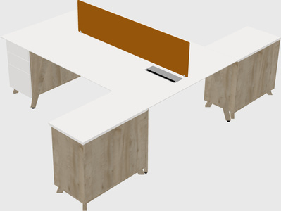 Slick White Shared L-shaped Office Desk + Storage Cabinet + Desk Return + Ochre Desk Divider For 2 Persons