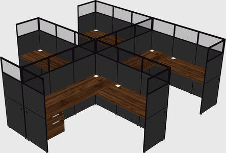 Columbia Walnut Shared L-Shaped Office Cubicle Panel System With Hanging Drawers For 4 Persons