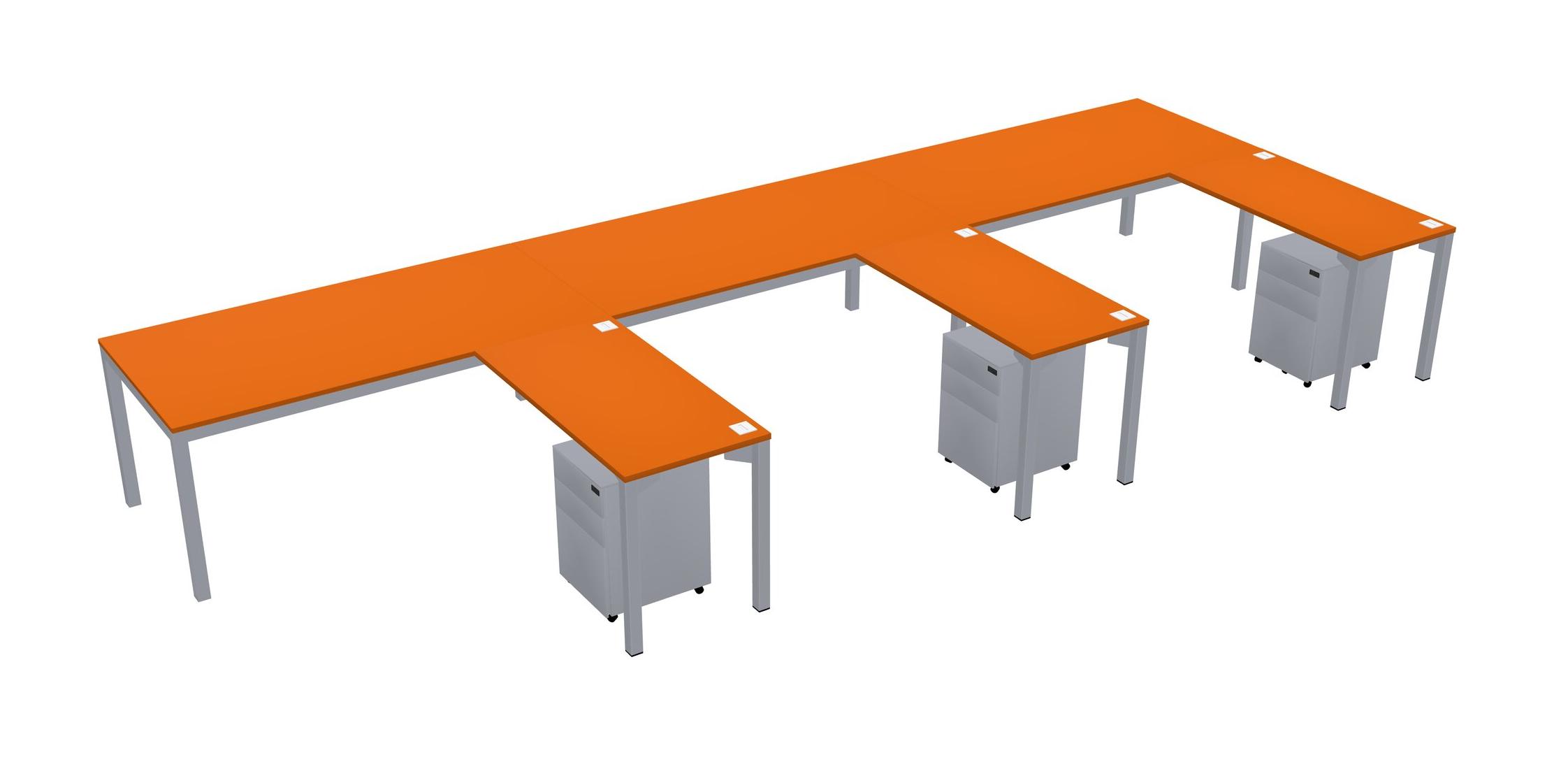 Orange L-shaped Office Desk With Metal Mobile Drawers For 3 Persons