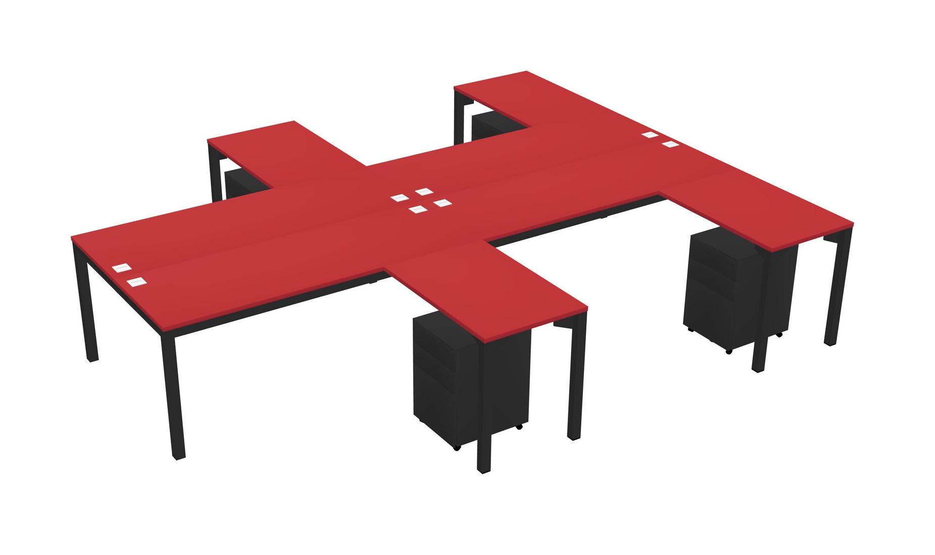 Prism Red Shared L-shaped Office Desk With Metal Mobile Drawers For 4 Persons