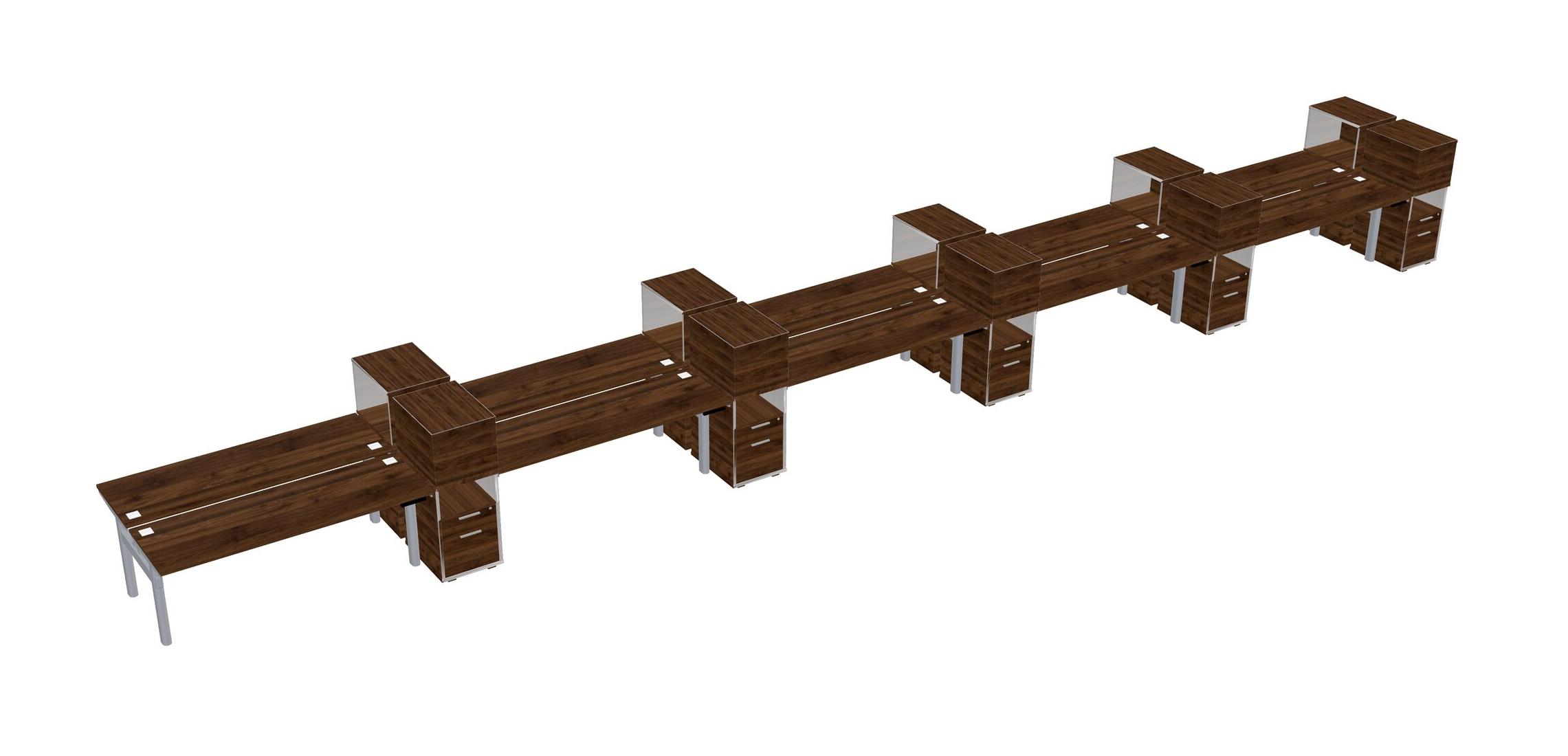 Columbia Walnut Shared Dual Motor Electric Height Adjustable Desks With Side Cabinets For 10 Persons