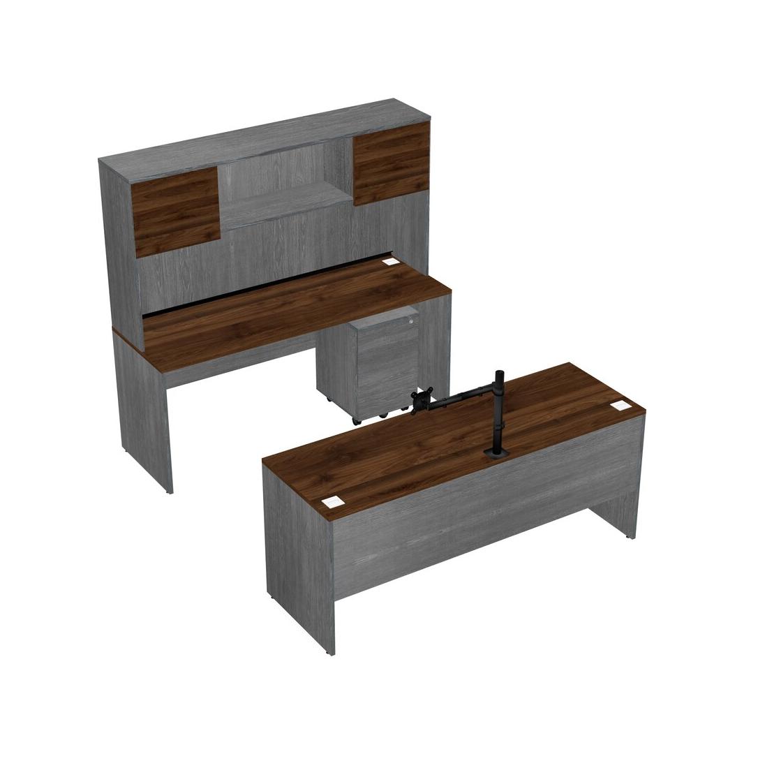 Office Parallel Desk Credenza Desk + Wooden Mobile Drawers + Hutch + Monitor Arm (single Arm)