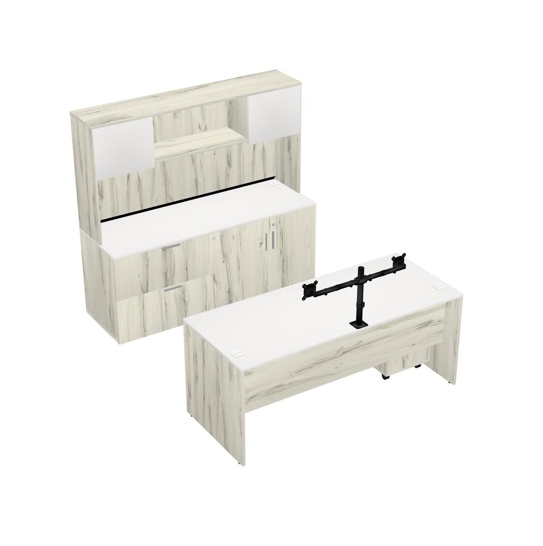 White Office Parallel Desk With Lateral Storage Combo + Wooden Mobile Drawers + Hutch + Monitor Arm (double Arms)