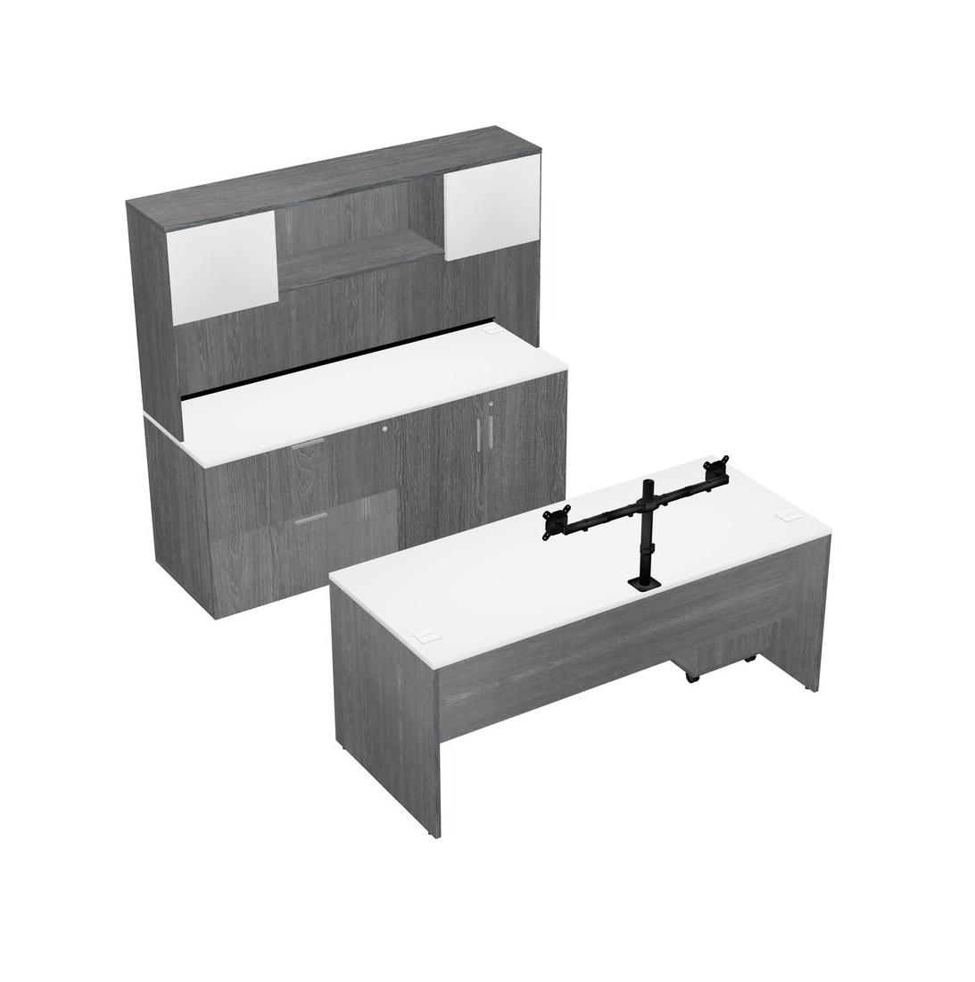 White Office Parallel Desk With Lateral Storage Combo + Wooden Mobile Drawers + Hutch + Monitor Arm (double Arms)