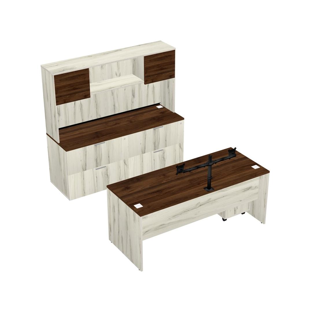 Columbia Walnut Office Parallel Desk With Lateral File Cabinet + Wooden Mobile Drawers + Hutch + Monitor Arm (double Arms)