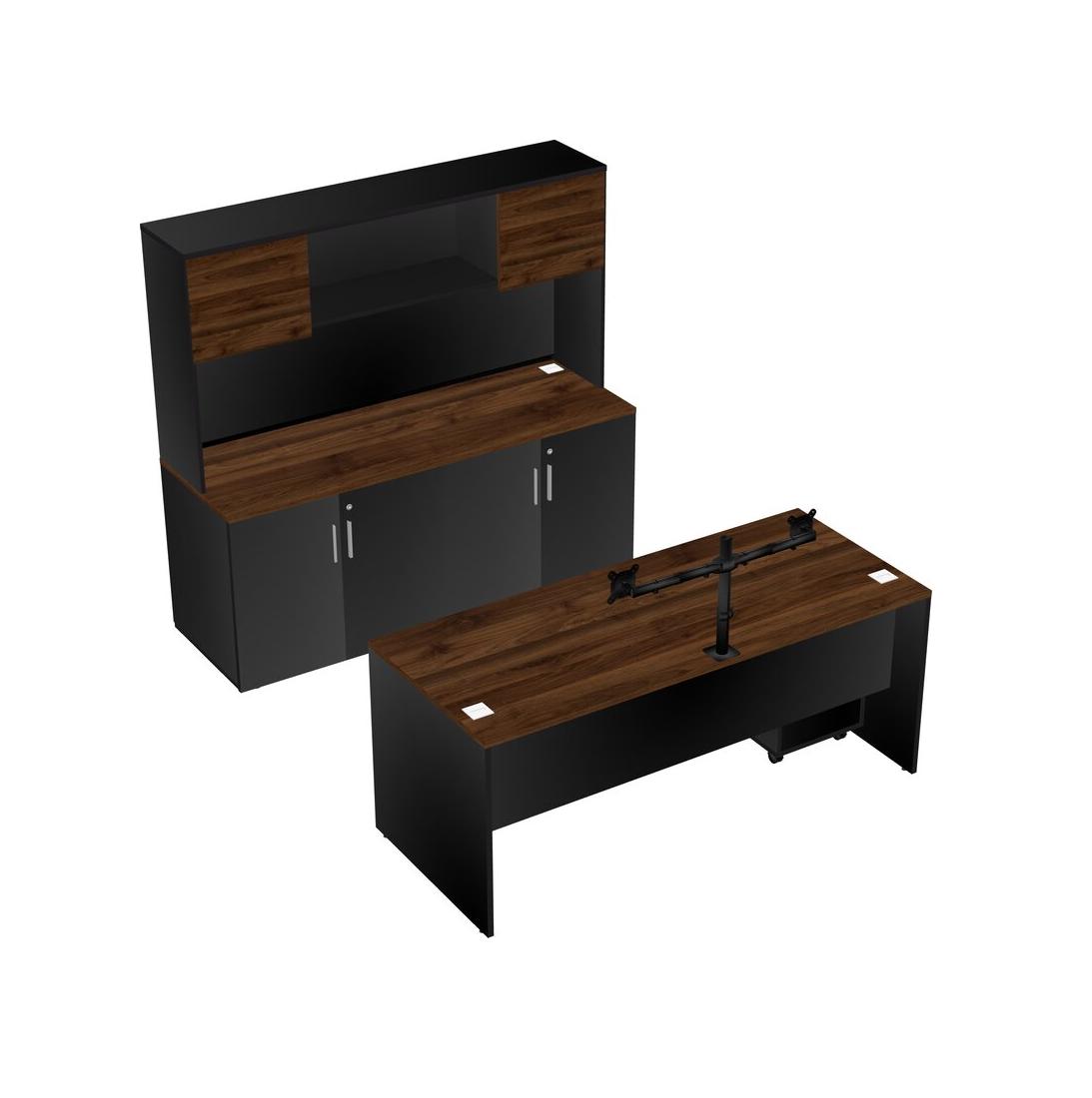 Columbia Walnut Office Parallel Desk With Storage Cabinet + Wooden Mobile Drawers + Hutch + Monitor Arm (double Arms)