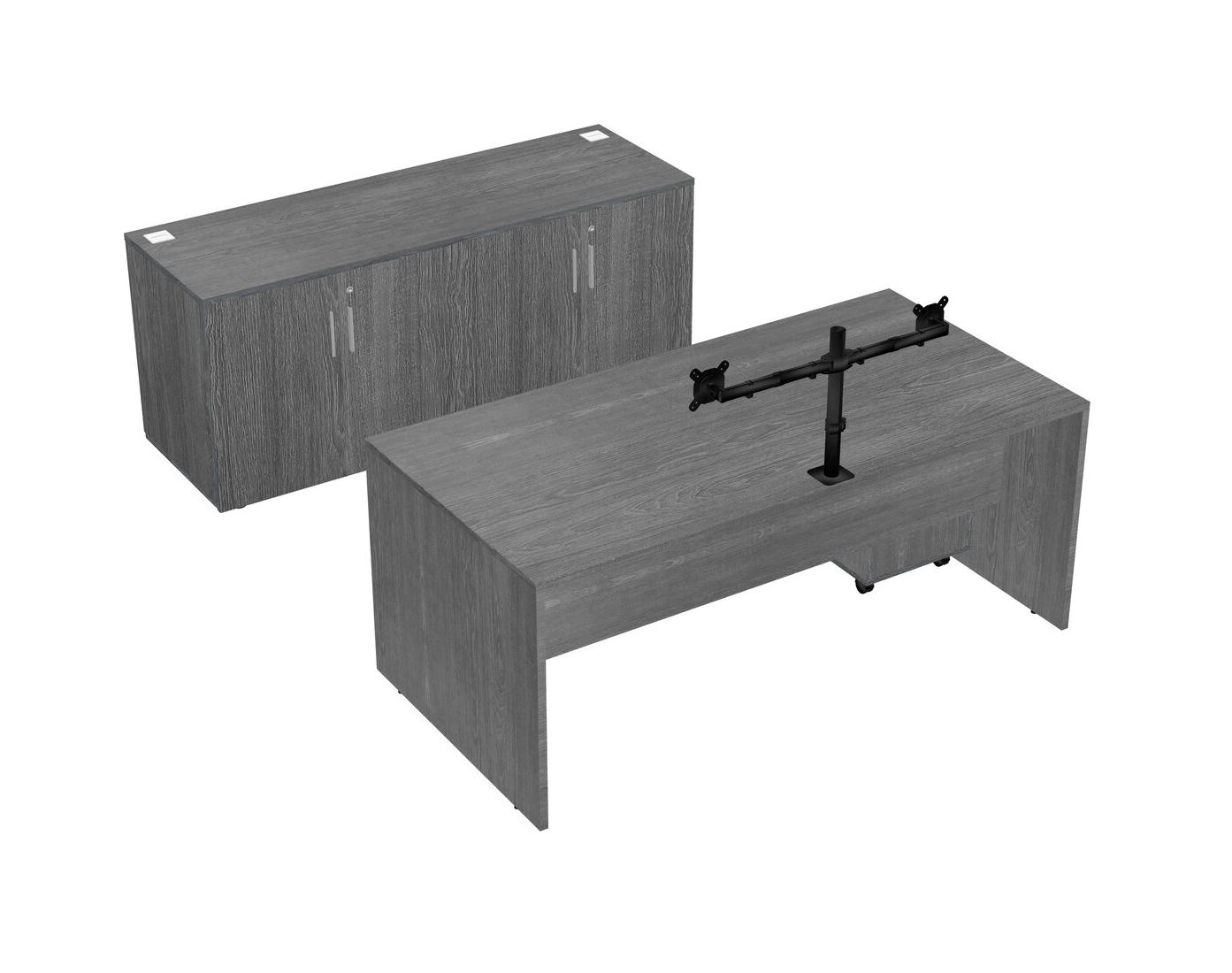 Grey Office Parallel Desk With Storage Cabinet + Wooden Mobile Drawers + Monitor Arm (double Arms)