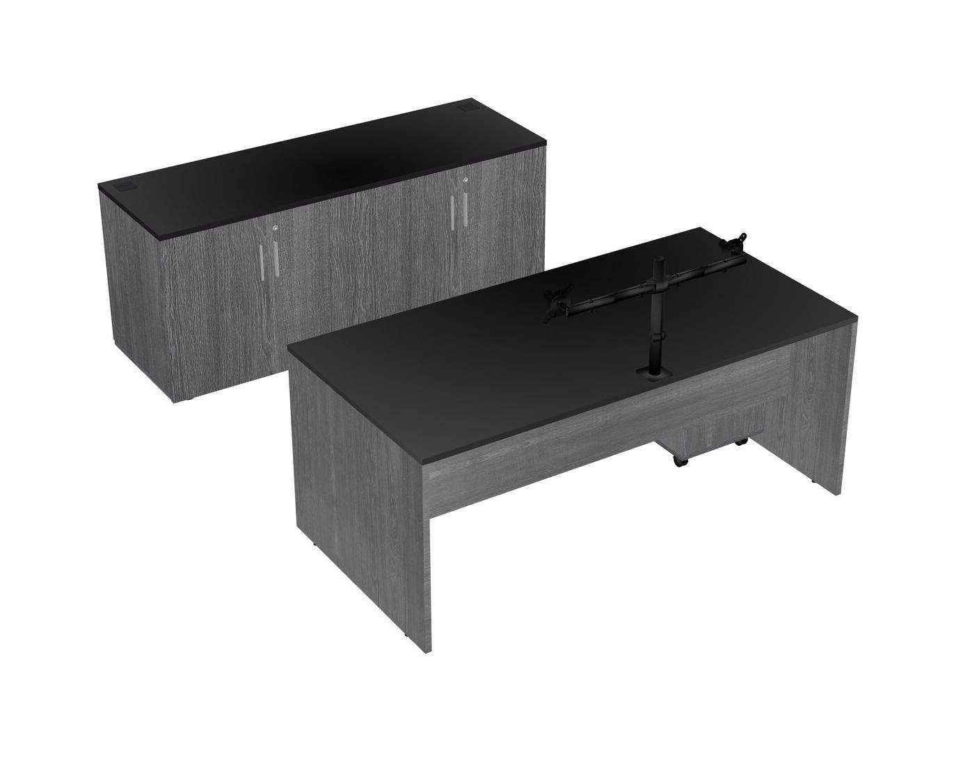 Black Office Parallel Desk With Storage Cabinet + Wooden Mobile Drawers + Monitor Arm (double Arms)