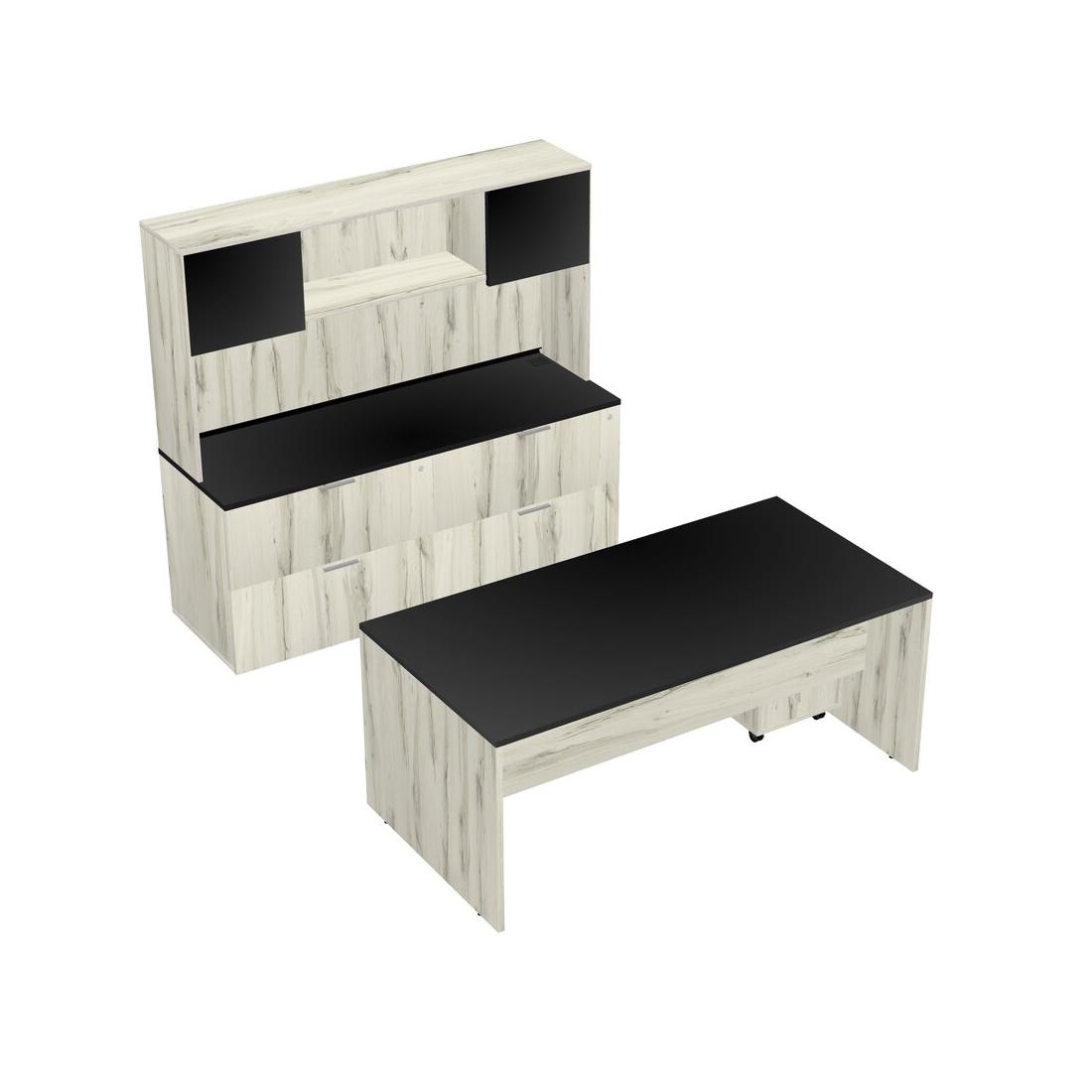 Black Office Parallel Desk With Lateral File Cabinet + Wooden Mobile Drawers + Hutch